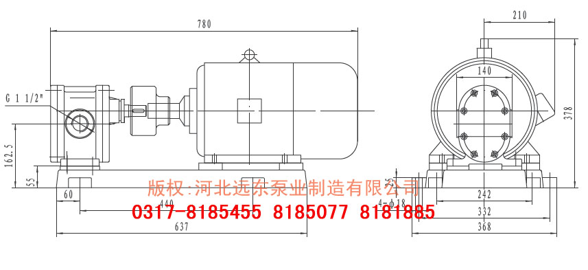2CY7.5齒輪泵,流量:7.5m3/h,壓(ya)力:0.6Mpa,吸入真空高度(dù):2米,口徑:G1 1/2",功率:5.5KW 2CY7.5齒輪(lun)油泵配5.5kw-4電機安裝(zhuang)尺寸圖